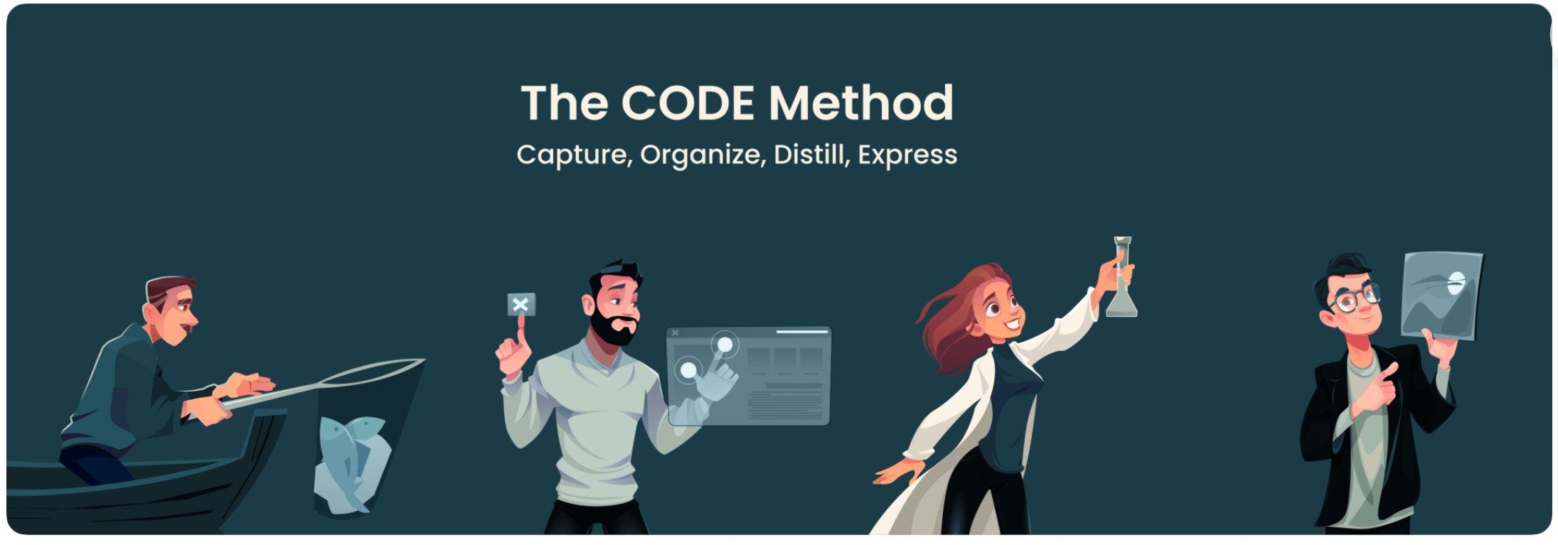 The goal of the CODE method is to enhance the brain's creativity with external tools and methodologies, compensating for the congenital deficiencies of our biological brains. This simple method consists of four steps: Capture, Organize, Distill, and Express. CODE is the abbreviation of the first letters of these four steps.